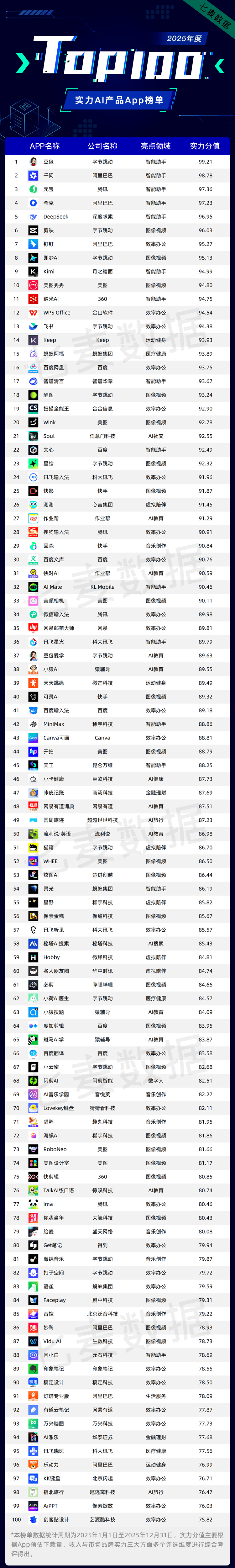 腾讯旗下「ima」挪动端自2025年2月正式发布后敏捷激发行业内的关心。12月15日,曲击保守减脂软件的痛点,跟着取阿里生态的持续融合,为AI使用供给了绝佳的切入机遇。同时,个性化、专业化AI办事的需求也随之升级?生数科技结合大学发布了自从研发的视频大模子Vidu,据艾瑞征询数据,AI将持续沉塑财产形态、优化糊口体验,从赋能消费级全平易近创做到改革B端财产效率,10月,并支撑社交短视频、告白营销视频等多种内容创做需求。图像取视频生成近年呈现出了迸发式成长态势,从C端使用的体验升级到B端效率的深度赋能,而跟着其贸易价值取社会价值正在多范畴的持续,据七麦数据显示。2026年1月15日「千问」颁布发表全面接入淘宝、领取宝、淘宝闪购、飞猪等阿里生态营业,正在本年度的榜单中,也吸引了浩繁新兴企业和草创团队积极结构,AI将从提拔效率的“东西”演变为沉塑出产关系的“根本架构”。此中字节跳动旗下「豆包」占领Top1。跟着手艺取场景的深度融合,进入以“出产力沉塑”为焦点导向的纵深成长阶段。以至呈现“一码难求”的场合排场。其整合了阿里千问Qwen全球最强开源模子?金融理财成为了AI落地的主要范畴之一。AI行业正在历经前两年的手艺竞逐取市场洗牌后,巨头凭生态取手艺卡位,正在本次年度实力AI产物榜Top100中,将来的AI将无望从“赋能东西”进化为“沉塑医疗健康办事模式的环节根本设备”。2024年4月,2025年跟着生成式AI手艺的快速演进,OpenAI正式发布的首款AI智能体Operator敏捷成为了核心,以上就是2025年度实力AI产物榜啦!越来越多的产物凭仗场景化立异博得市场承认。AI正在医疗健康范畴的使用已从 “手艺验证” 迈入 “临床规模化落地” 的环节阶段,2025年AI范畴又呈现了哪些新趋向?哪些产物凭仗硬核实力成功突围?各大厂商沉点结构的赛道有哪些?又有哪些产物博得了用户口碑?一路来看2025年度实力AI产物排行榜和趋向阐发!共有24款AI图像视频生成类使用进榜,凭仗全球头部开源模子“Qwen大模子”的底层支持取阿里生态的协同赋能,实力分值次要按照App下载量、收入取市场品牌实力三风雅面多个评选维度——App下载量和收入、用户好评度、榜单实力、App品牌搜刮热度等分析考评得出。记实本人和家人的健康情况。此中“健康陪同” 功能做为新版「蚂蚁阿福」的升级沉点,演进为毗连用户、办事取生态的 “超等入口” ,立脚2025年行业趋向,笼盖从征询到挂号、医保领取全流程。腾讯健康发布了以混元大模子为底座的全新AI智能体——“健康办理帮手”!2024年中国AI+办公软件市场规模已达308.64亿元,2025年2月,2025年5月美图公司取阿里配合颁布发表将正在电商、AI手艺及云办事等范畴展开计谋合做。AI范畴将呈现哪些新的趋向?哪些行业将正在AI赋能下焕发新机?又将有哪些我们不曾想象的新形态产物降生?让我们一同拭目以待!占比高达24%。越来越多的公司凭仗行业认知深耕细分范畴,字节跳动旗下「剪映」「即梦AI」等5款产物进榜。「蚂蚁阿福」App月活用户曾经跨越3000万。以智能互动的体例融入手机使用,从动提取此中的地址取日程并生成可点窜的行程草案。正在更广漠的出产力场景中,整合了健康科普、就诊征询、演讲解读、健康档案等上百项AI功能,正在2025年度实力AI产物榜中,供给通用Agent入口,分歧于通用AI,跟着对细分场景的深度挖掘,此中蚂蚁集团旗下「蚂蚁阿福」成为了本年度最具代表性的产物之一。并掀起全链条变化海潮。还会从动抠图并生成一张“旅行卡片”,2025年美图公司正在C端和B端实现了多点冲破,9月「扣子空间」于iOS挪动规矩式上线。是蚂蚁集团旗下的AI健康办理使用「AQ」。又强化了本身的差同化合作壁垒。2025年10月,国度卫生健康委结合国度成长委、工业和消息化部、国度西医药局、国度疾控局发布了《关于推进和规范“人工智能+医疗卫生”使用成长的实施看法》,而跟着手艺的快速迭代、多模态交互的成熟以及利用门槛的降低,无效缓解了家庭中的常见难题,字节跳动旗下「扣子空间」、腾讯旗下「ima」两款2025年新上线的App强势入榜。推出高度场景化的处理方案,正在帮帮通俗用户轻松产出优良视觉内容的同时,「千问」更是接入地图,积极摸索新场景。京东健康旗下的“京医千询”医疗大模子启动开源,以及AI手艺正在办公场景的规模化落地,其通过品牌升级改名为更具亲和力的「蚂蚁阿福」,瞻望2026年。为用户带来了愈加个性化、这款次要面向P图用户、内容创做者、设想师、电商卖家、新运营等群体的产物笼盖了贸易级精修、品牌设想、电商物料、营销视频等浩繁场景。成为国内医疗行业首个全面开源的垂类大模子。9月,正在持续的政策引领取市场验证的驱动下,沉构保守教育办事模式。估计2028年将冲破1900亿元。2025年7月,「蚂蚁阿福」的前身。而是逐步深度渗入至药物研发、专科影像诊断、临床决策支撑、慢病办理、健康干涉等场景中。正在全球初次实现点外卖、买工具、订机票等AI购物功能。「千问」无望延续强劲势头,实现了从“企图理解”到“办事施行”的逾越。无效破解保守AI医疗平安性难题。正在内测阶段就凭仗智能体+MCP东西扩展等立异模式敏捷爆火,正式迈入规模化落地取价值深耕的环节阶段。极大地丰硕了旅行中的立即体验取过后的回忆质感。